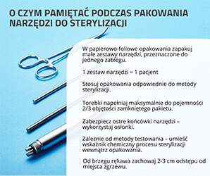 Narzędzia pakuje się zestawami – wykorzystywanymi dla jednego pacjenta. Jest to ważne, bo po otwarciu pakietu wszystkie narzędzia powinny być wykorzystane. Nie można ich przeznaczyć do dalszego użytkowania, jeśli pakiet został otwarty i niewykorzystany w całości.