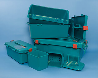 - Aby pozostawić kontenery sterylizacyjne w stanie nieskażonym należy łapać jedynie za ich uchwyty, rączki. To zapobiega skażeniu. Po zdjęciu pokrywy rozwija się sterylną serwetę pojemnika i przykrywa jego brzegi.
